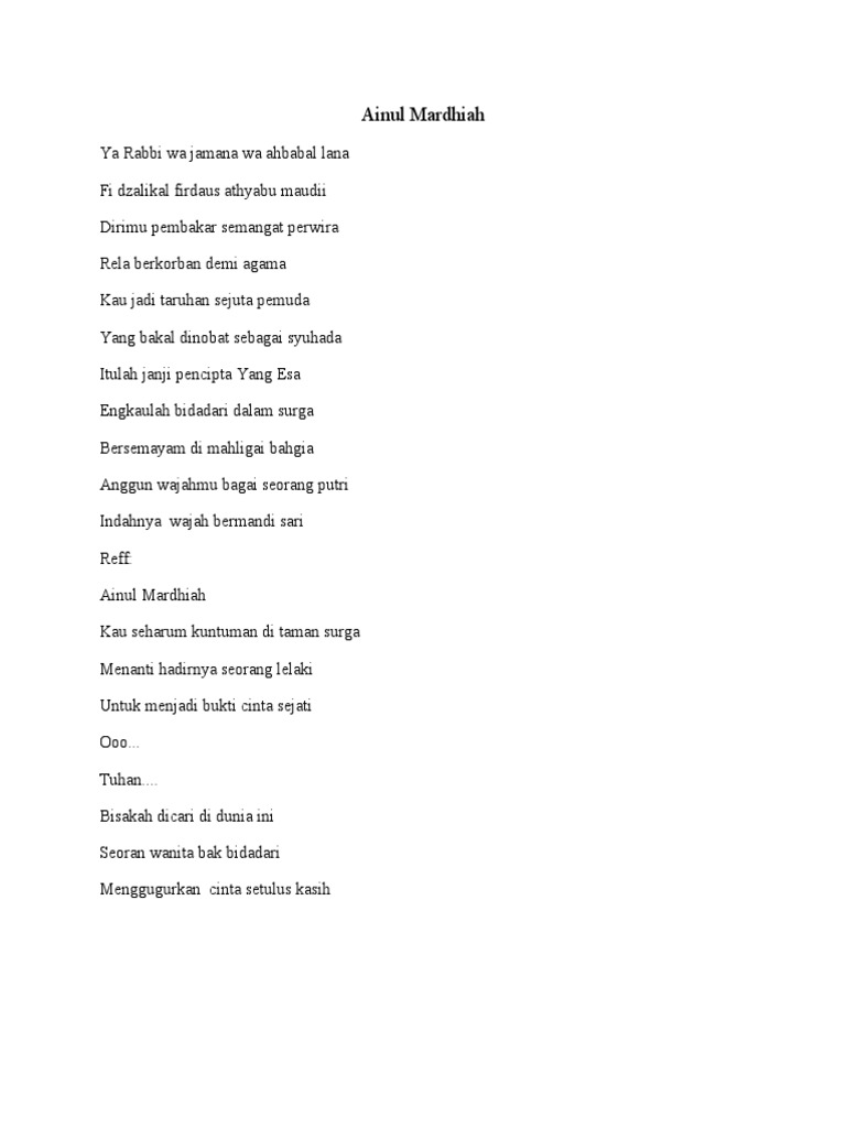 Lirik lagu ainul mardhiah Indahnya wajah bermandi seri. Dirimu pembakar semangat perwira. Yang bakal dinobat sebagai syuhada.