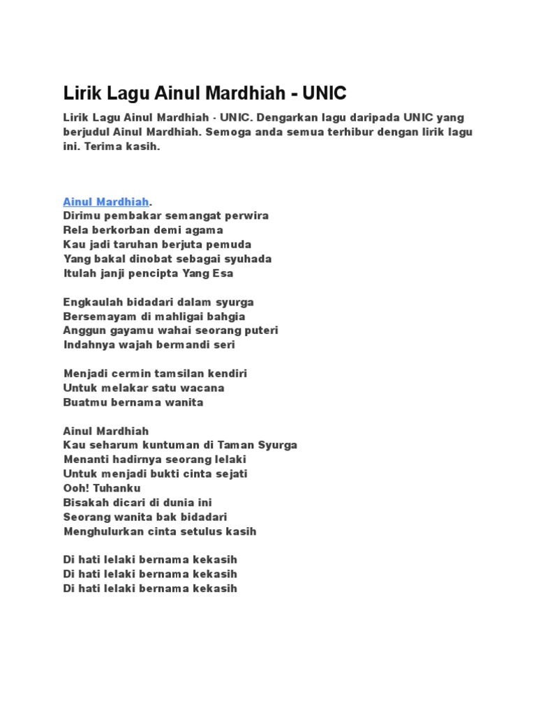 . Taubat 1710 0 Read More. Ampunkanlah aku --------------- Op. Lirik lagu UNIC-Ainul Mardhiah by puankuci - Jun 05 2017 UNIC-Ainul Mardhiah.